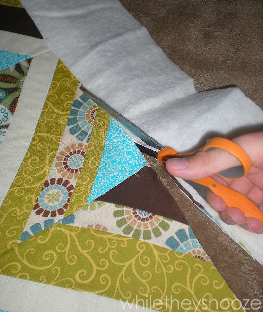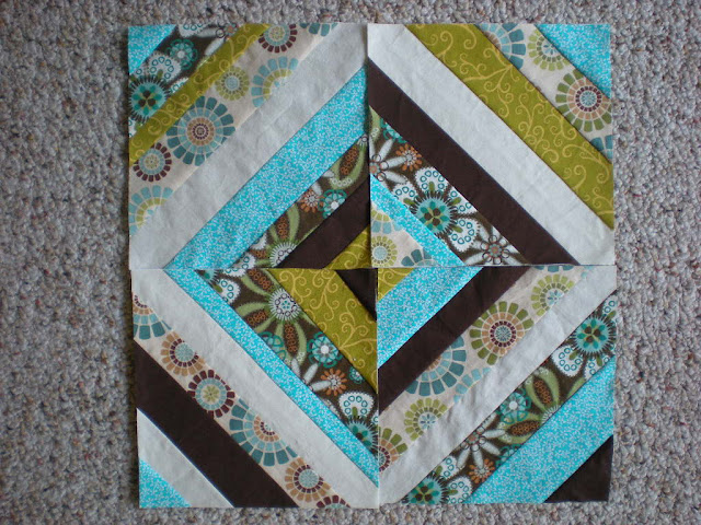 As you can see, my squares didn't line up perfectly. : ) I'd also like to point out the different beige fabrics here. That's because I ran out of my beige fat quarter and had to cut some strips from another beige fabric I had in my stash. Still looks good to me.
