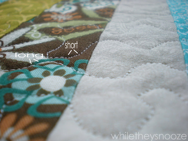 It's a little weird to get used to sewing sideways, backwards, diagonal, etc. If you're unsure, practice on a scrap first to get the hang of it. Also, a helpful tip: put on some rubber gloves! I know, weird. But, it's so much easier for your hands to grip your quilt and move it smoothly with them on. I used my good ole rubber kitchen gloves :)