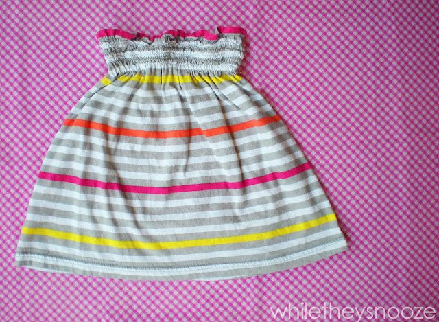 I made my stitch length 5 and my tension 7 and it started to shirr! As you can see, I was so sick of seam ripping at this point, I just sewed right over the messed up lines. Whatever, she's going to spill juice on it anyway. Just sew line after line about 1/2 inch apart... as many as you want.